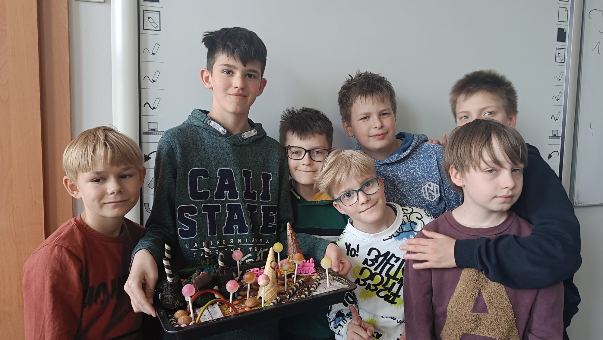 Omawianie lektury „ Charlie i fabryka czekolady” w klasie IV c zaowocowało zajęciami, podczas których uczniowie wykonywali projekt fabryki Willego Wonki. Było naprawdę słodko i wykonana fabryka wyglądała smakowicie. Po kilku dniach model został spałaszowany, ale zdążyliśmy go upamiętnić na pamiątkowej fotografii.