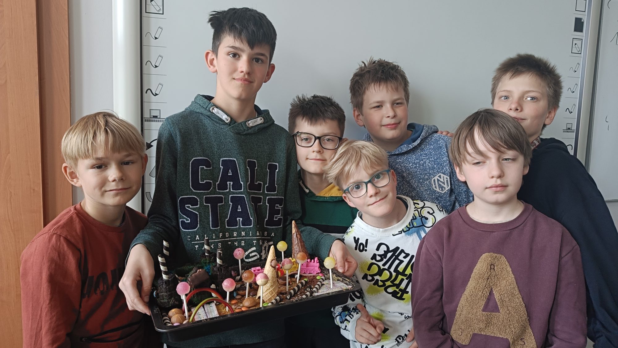 Omawianie lektury „ Charlie i fabryka czekolady” w klasie IV c zaowocowało zajęciami, podczas których uczniowie wykonywali projekt fabryki Willego Wonki. Było naprawdę słodko i wykonana fabryka wyglądała smakowicie. Po kilku dniach model został spałaszowany, ale zdążyliśmy go upamiętnić na pamiątkowej fotografii.