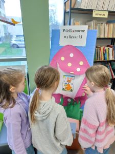 W jaju bibliotecznym znajdowały się zadania do rymowania.  Uczniowie  z entuzjazmem tworzyli  rymy  o tematyce wielkanocnej.